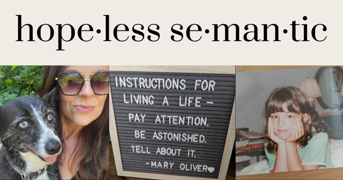Let me tell you what “here” is: “Hopeless Romantic” describes a person in love with love. I am a Hopeless Semantic. A person in love with meaning. With language and subtext and the stories we tell ourselves about who we are, how we got here, and what we’re going to do about it.